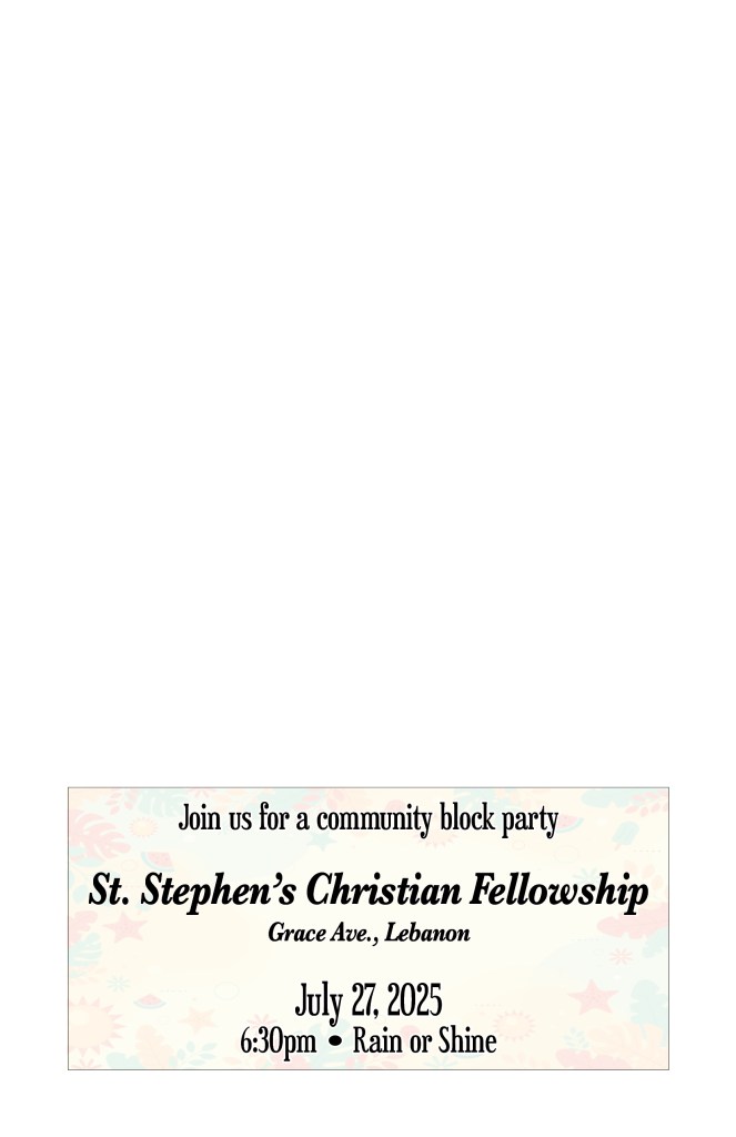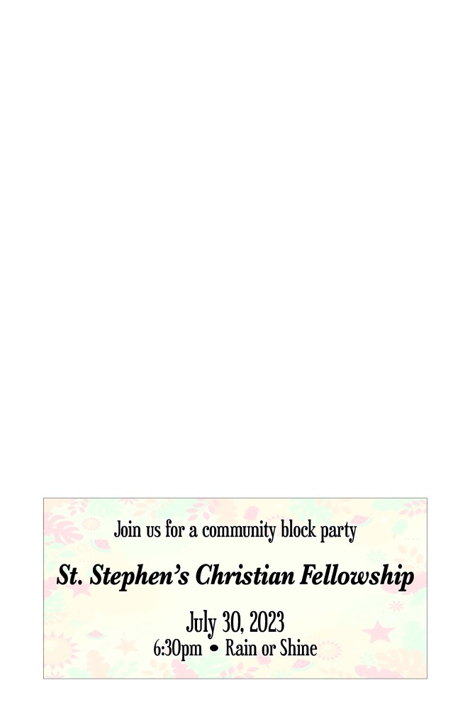 July 27, 2025 – Join us for a community block party hosted by St. Stephen’s Christian Fellowship!
